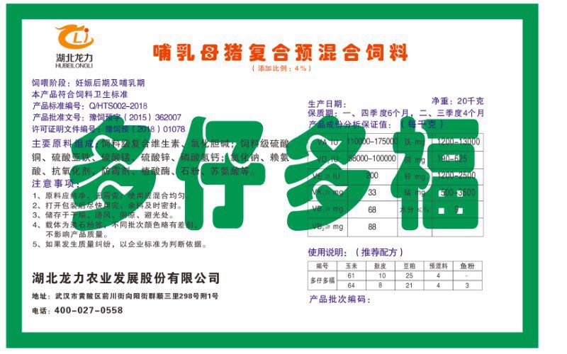 湖北龍力農(nóng)業(yè)發(fā)展股份有限公司坐落于武漢市黃陂區(qū)前川街向陽街群順三里298號附1號。公司成立于2014年6月,公司自成立以來把“創(chuàng)全球最大養(yǎng)豬綜合服務”為企業(yè)愿景。致力于打造教保料品牌”作為公司發(fā)展的明確目標。公司一直致力于豬營養(yǎng)的研究和開發(fā),積極與國內(nèi)外高校和科研機構(gòu)合作,推廣養(yǎng)豬技術(shù)、動物營養(yǎng)新概念,向世界農(nóng)牧企業(yè)學習與合作。公司采用國內(nèi)先進的生產(chǎn)工藝,選擇高精度電子配料秤,高均勻度、無殘留混合機等先進設備....
